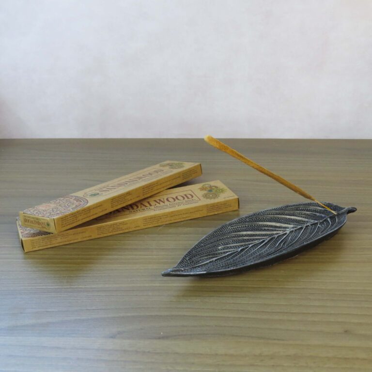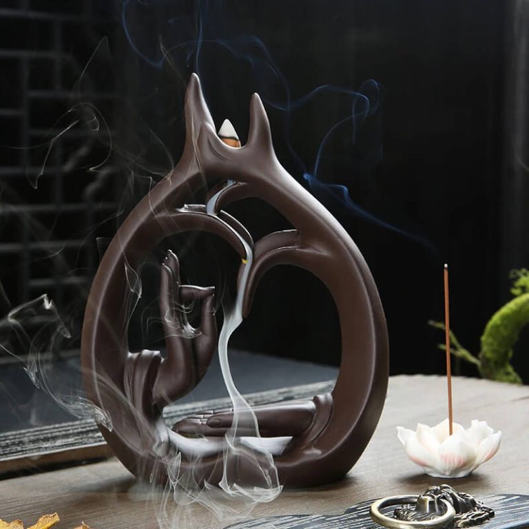 Conta com um suporte para cone de incenso que gera o efeito cascata sobre a mão de Buda.