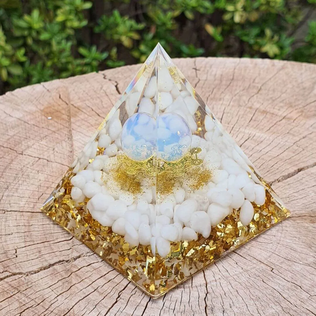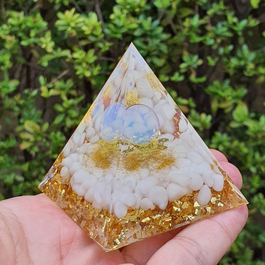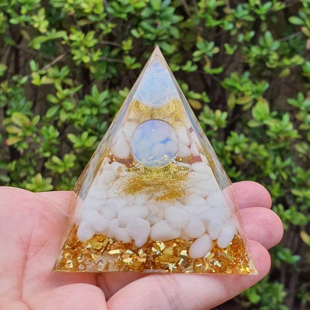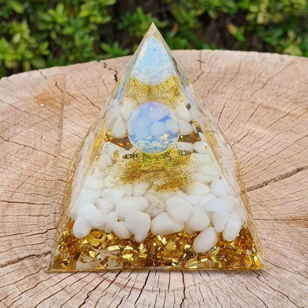 Orgonite piramidal com base de 6cm feita à mão, tendo como pedras principais o quartzo leitoso e a opalina, sendo a quartzo leitoso o cascalho na base e a opalina a esfera mais centralizada.