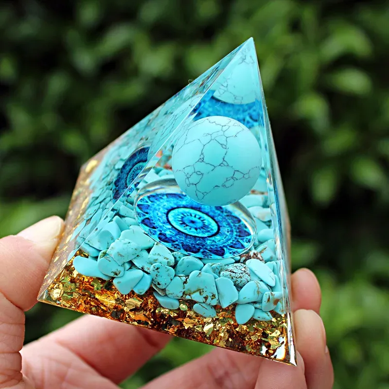 Orgonite em forma de pirâmide com base de 6cm feita à mão, tendo como pedra principal a turquesa.