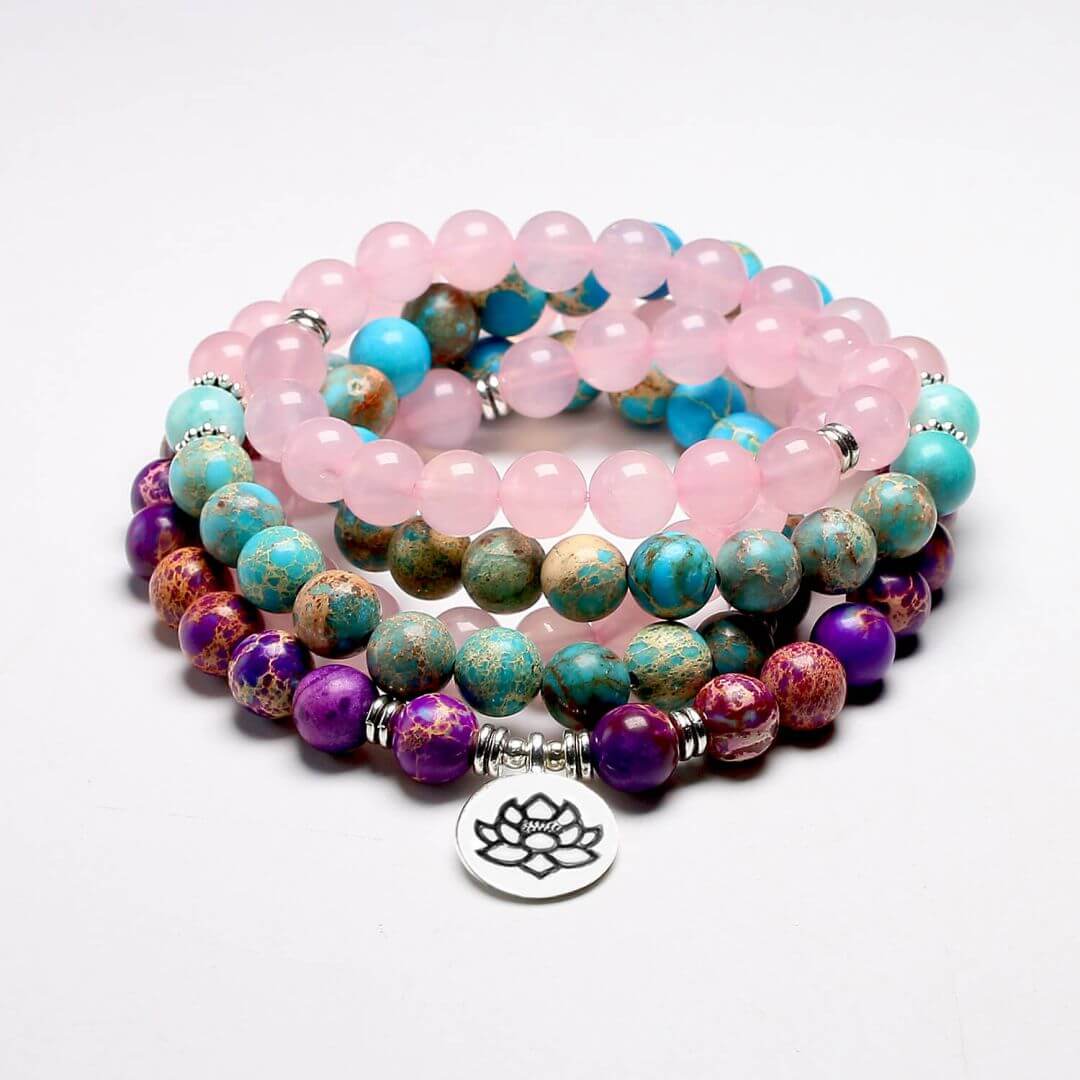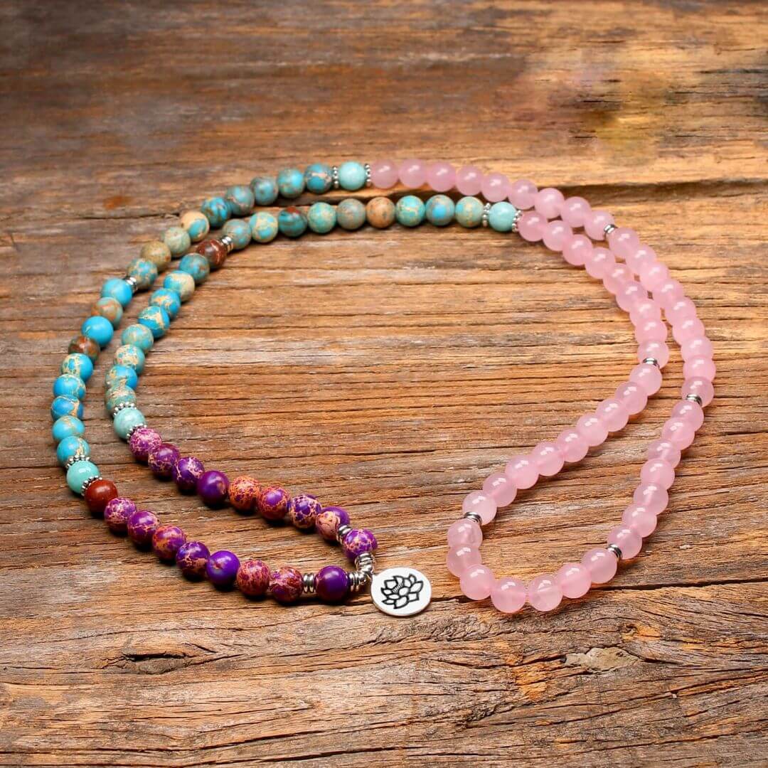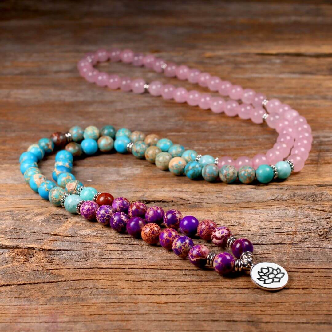 Lindo japamala de 108 contas feito com 4 tipos de pedras naturais de 8mm, as pedras são quartzo rosa, jaspe imperial, turquesa e amazonita.